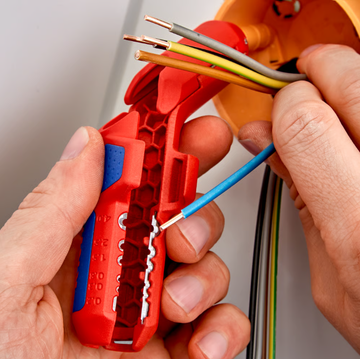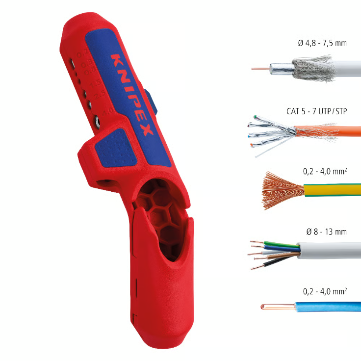 - Per spelare in modo rapido e preciso i cavi elettrici più comuni a sezione tonda e i cavi per ambienti umidi (ad es. cavi NYM 3 x 1,5 mm fino a 5 x 2,5 mm ), cavi per trasmissione dati (ad es. Twisted-Pair) e cavi coassiali